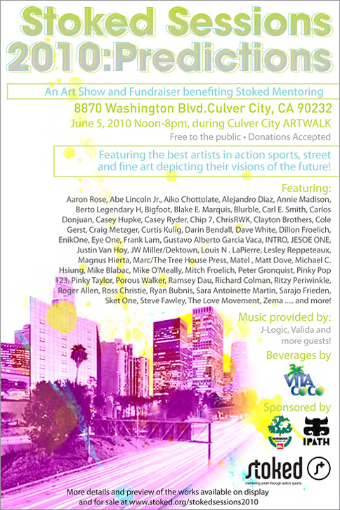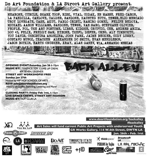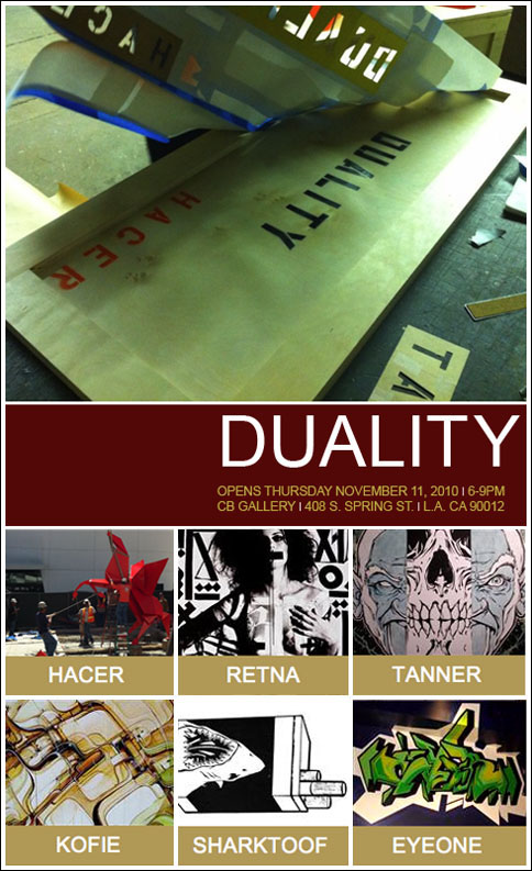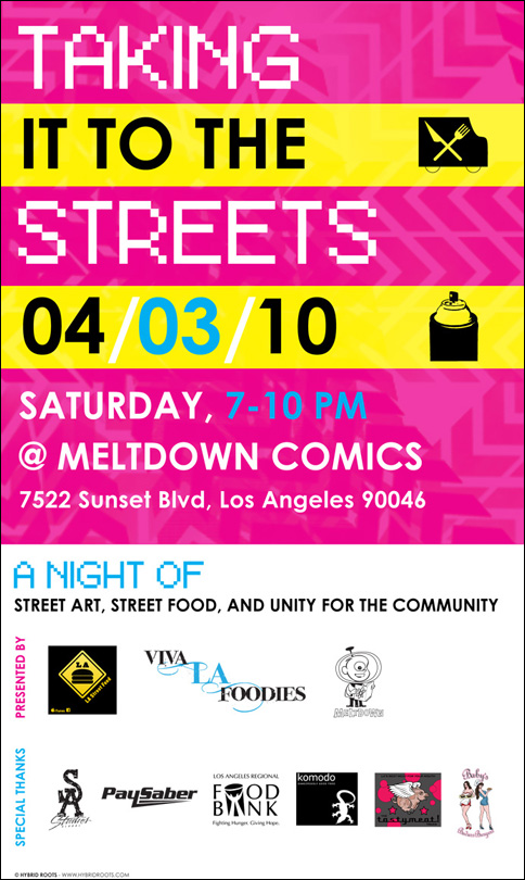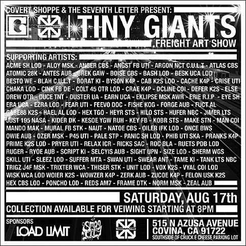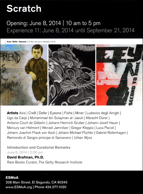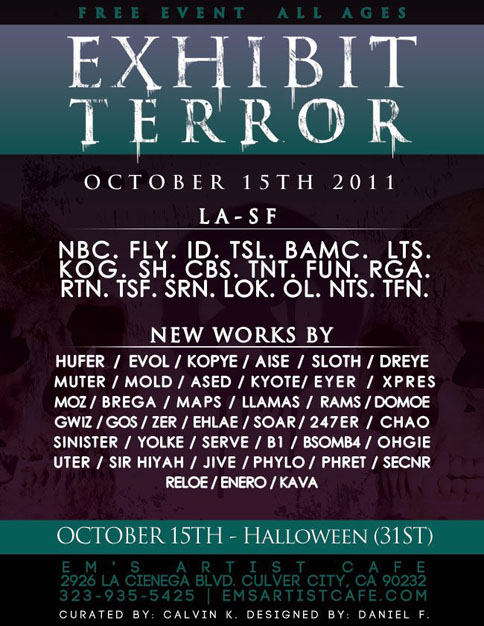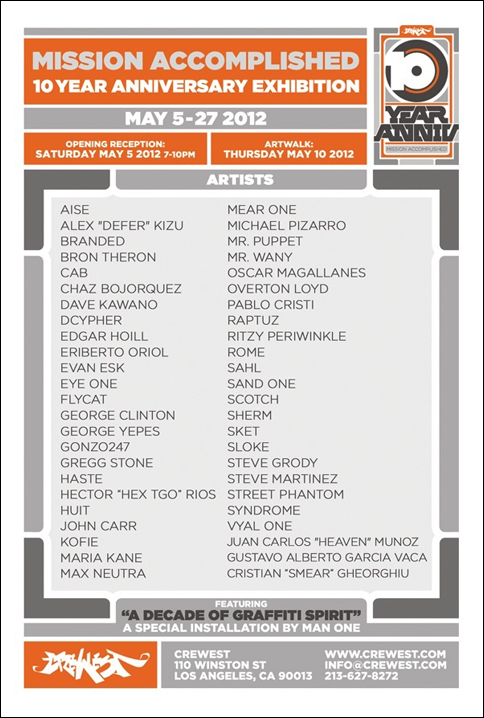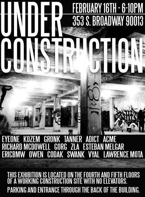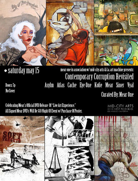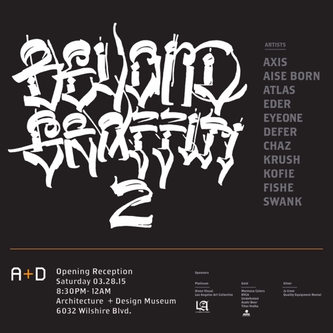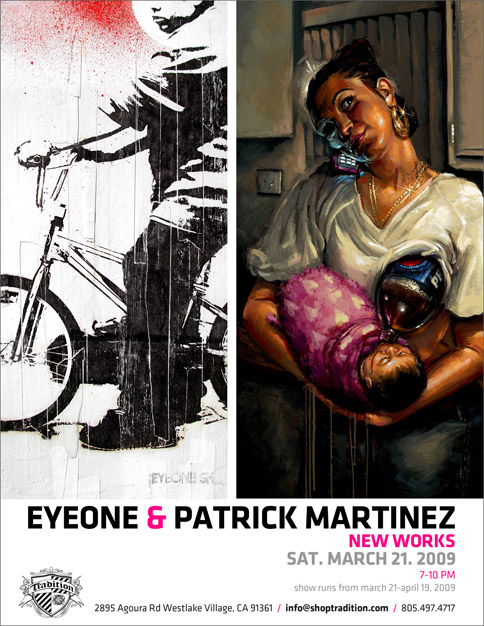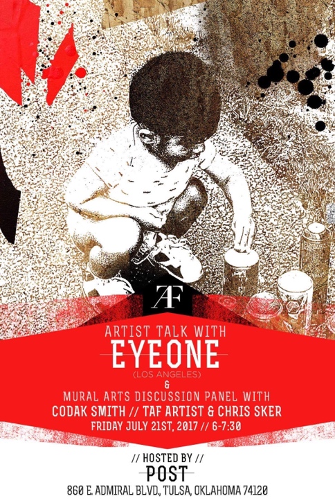 Eyeone x Zero+ Publishing ![]() Zero+ Publishing has just released a special edition monograph of my work. July 21, 2017 ![]() I'll be giving an artist talk at POST in Tulsa, Oklahoma in conjunction with the Tulsa Artists Fellowship. Talk: July 21, 2017 | 6 PM - 7:30 PM POST 860 E. Admiral Blvd. Tulsa, Oklahoma 74120 POST | TAF January 12 - January 15, 2017 ![]() I'll be showing some recent works at Photo L.A. Opening: January 12, 2017 | 7 PM - 10 PM Photo L.A. at The REEF 1933 S. Broadway Los Angeles, CA 90007 Photo L.A. October 22, 2016 ![]() I have some work in Collaboration curated by Zero+ Publishing at the Barret Art Gallery. Opening: October 22, 2016 | 6 PM - 8 PM SMC Barrett Art Gallery 1310 11th Street Santa Monica, CA 90401 Zero+ Publishing October 19-21, 2016 ![]() I have some work in the art exhibit for Acting Out! curated by Derek Hess. Opening: October 21, 2016 | 5 PM - 9 PM Derek Hess Gallery 1300 W. 78th St., 2nd Floor Cleveland, OH 44102 actingoutcle.com March 28 - June 2015 ![]() I have some work in BEYOND GRAFFITI 2 coming up at the A + D Museum. Opening: March 28, 2015 | 8 PM - 12 AM A + D Museum 6032 Wilshire Blvd. Los Angeles, CA 90036 aplusd.org June 8 - September 21, 2014 ![]() I co-curated SCRATCH in collaboration with the Getty Research Institute currently on view at ESMoA in El Segundo Opening: June 8, 2014 | 10 AM - 5 PM ESMoA 208 Main St. El Segundo, CA 90245 esmoa.org March 13 - July 12, 2014 ![]() I have a piece inr L.A. Heat coming up at the Chinese American Museum. Opening: March 13, 2014 | 7 PM - 9 PM Chinese American Museum 425 N. Los Angeles St. L.A., CA 90012 camla.org Getty Blackbook Project ![]() I am one of the curators and a contributing artist to the L.A. Liber Amicorum a.k.a. Los Angeles Graffiti Blackbook for the Getty Research Institute rare book collection. Viewable online here. August 17, 2013 ![]() I painted a miniature train for Tiny Giants at Covert Shoppe. Opening: August 17, 2013 | 7 PM-11 PM Covert Shoppe | 515 N. Azusa Ave. | Covina, CA 91722 covertwebsite.com June 7, 2013 ![]() Cache and I painted a bike for the CBNC 5 Year Anniversary Pop-Up Shop. 5 Year Anniversary Party Friday June 7, 2013 | 7 PM-12 AM 7020 Melrose Ave. | Los Angeles, 90038 February 28, 2013 ![]() I have a couple of pieces in the OXY/NELA Bike Art Show.. Opening: Thursday February 28, 2013 | 6-9 PM Weingart Art Gallery / Occidental College | 600 Campus Rd | Los Angeles, 90042 February 17, 2013 ![]() I'm sharing a table at the L.A. Zine Fest 2013. Opening: Sunday February 17, 2013 | 11 AM-5 PM Ukrainian Cultural Center | 4315 Melrose Ave. | Los Angeles, CA 90029 February 16, 2013 ![]() I'm in a group show called Under Construction in Downtown L.A. Opening: Saturday February 16, 2013 | 6-10 PM 353 S. Broadway | Los Angeles, CA 90013 February 16, 2013 ![]() I'm in a group show at Hatakeyama Gallery. Opening: Saturday February 16, 2013 Hatakeyama Gallery | 905 S. Hill St. | Los Angeles, CA 90015 January 26 - February 1, 2013 ![]() I'm in a group show called Back Alley. Opening: Saturday January 26, 2013 GR Works Gallery | 114 W. 4th St. | Los Angeles, CA 90013 December 22, 2012 ![]() I'm having a solo show at Seeleys Studios. Opening: Saturday December 22, 2012 | 7-11 PM Seeleys Studios / Unit 109 | 1800 S. Brand Blvd. | Glendale, CA 91204 December 8, 2012 ![]() I'm one of the participating artists in ARTCRANK LAX at Orange20. Opening: Saturday December 8, 2012 | 6-10 PM Orange20 | 4351 Melrose Ave. | Los Angeles, CA 90029 artcrank.com June 1 - October 19, 2012 ![]() I'm one of the participating artists in Post Humanity at spaceLUNA. On View: June 1, 2012 through October 19, 2012 | 6-11 PM spaceLUNA | 2404 Wilshire Blvd., Suite 1B | Los Angeles, CA 90057 laspaceluna.com May 5, 2012 ![]() I'm one of the participating artists in Crewest's 10 year anniversary show. Opening Reception: May 5, 2012 | 7-10 PM Crewest | 110 Winston St. | Los Angeles, CA 90013 crewest.com Getting Up: The TEMPT ONE Story | Coming Soon! January 1, 2012 ![]() October 15-October 31, 2011 ![]() I'm one of the participating artists in Exhibit Terror in Culver City. Opening Reception: Oct. 15, 2011 | 2-10 PM Em's Artist Cafe | 2926 La Cienega Blvd. | Culver City, CA 90232 emsartistcafe.com September 14-September 16, 2011 ![]() I'm one of the participating artists in ARTCRANK Interbike in Las Vegas. HOURS Wed & Thurs: 9 a.m. - 6 p.m. Fri: 9 a.m. - 4 p.m. Sands Expo Center / Urban Yard 201 Sands Ave. Las Vegas, NV 89109 artcrank.com For full artist line-up and more info, go to artcrank.com/interbike December 9, 2010-December 18, 2011 ![]() I have some work in Dreams Deferred at the Chinese-American Museum. Opening Reception: Dec 9, 2010 | 6 - 8:30 p.m. Chinese American Museum | 425 N. Los Angeles St. | Los Angeles, CA 90012 camla.org Featuring: Cache, Eriberto Oriol, Ernesto Yerena, Eyeone, Kofie, LeHumanBeing, Patrick Martinez, Shepard Fairey, Slick, Swank, Tempt + more! May 14, 2011-September 4, 2011 ![]() I have a piece in Street Cred at the Pasadena Museum of California Art. Opening Reception: May 14, 2011 | 7 - 10 p.m. Pasadena Museum of California Art | 490 E. Union Street | Pasadena, CA 91101 camla.org Featuring: Michael Alvarez, Angst, Axis, Chaz, Craola, Dash2000, Ekundayo, Eyeone, Alex Kizu, Augustine Kofie, Retna, Revok, Saber, Shandu, Siner, Zes, + more! May 7-May 8, 2011 ![]() Something neat awaits those who attend Unique L.A. this weekend. When: May 7-8, 2011 | 11 a.m. - 6 p.m. California Market Center Penthouse | 110 E. 9th St. | Los Angeles, CA 90079 uniquela.com Unique L.A. is the largest independent design show in the country. Attendees get the rare chance to meet and shop directly from over 300 hand-selected designers and artists (and nab a tote designed by someone named Eyeone.) March 12, 2011-April 2, 2011 ![]() I am in the Paint Factory exhibit at Alta Lofts, info below. Opening Reception: March 12, 2011 | 6 - 10 p.m. Alta Lofts | 200 N. San Fernando Road | Los Angeles, CA 90031 i